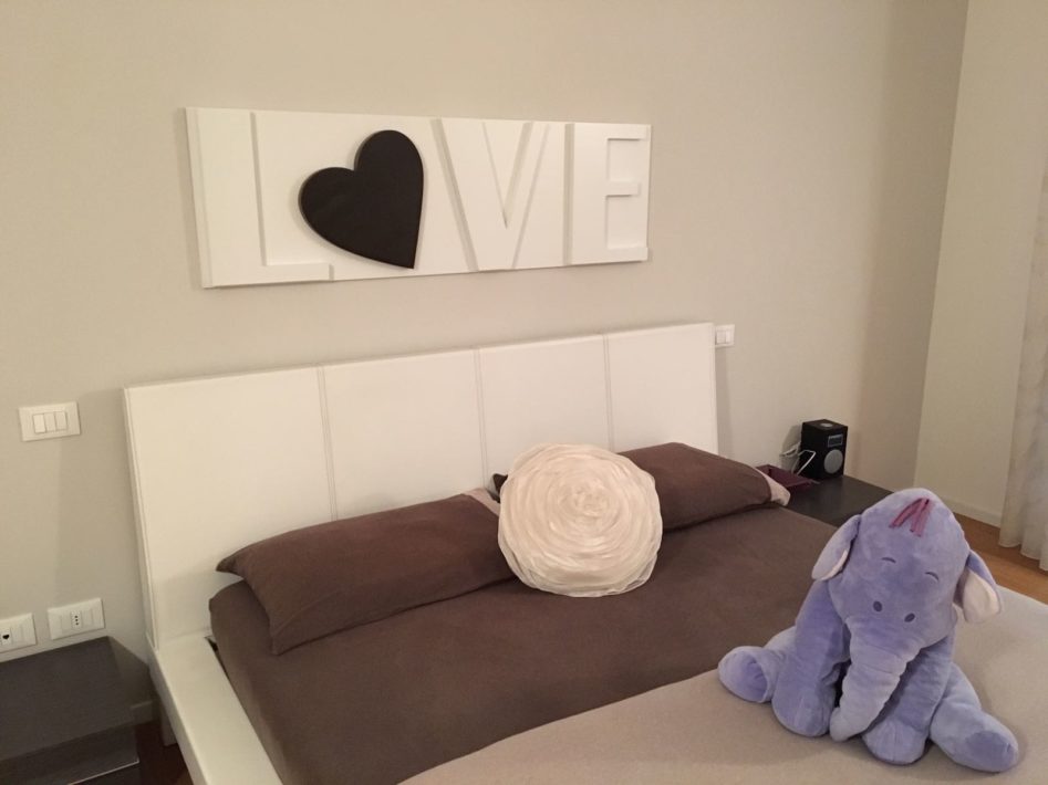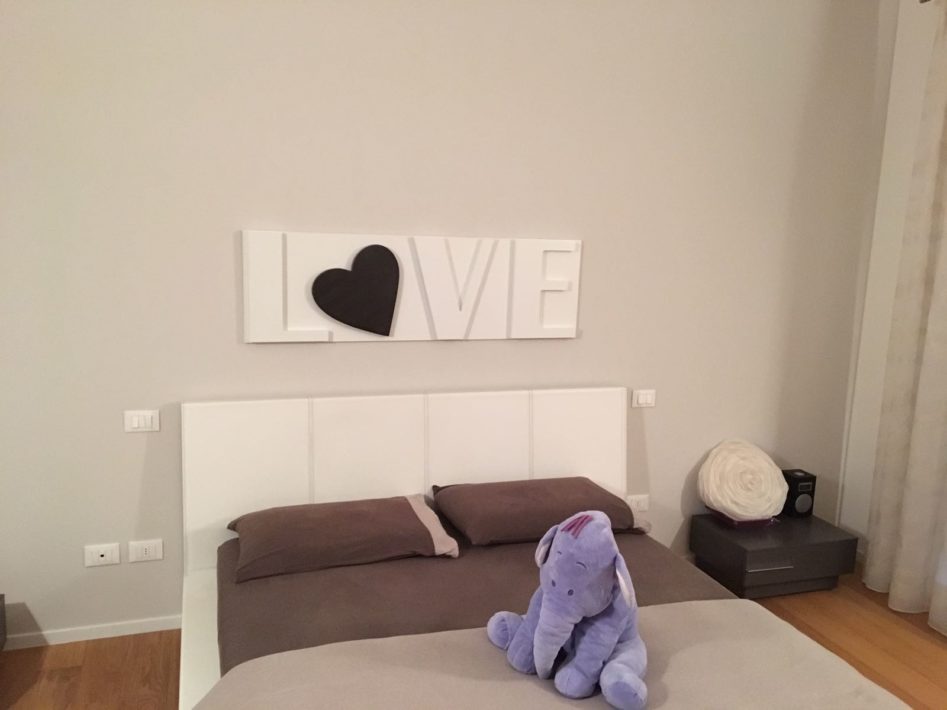 Pannello con scritta in rilievo utilizzando un carattere scelto dal cliente. Tutto laccato bianco eccetto il cuore che è stato eseguito in legno wengè.
