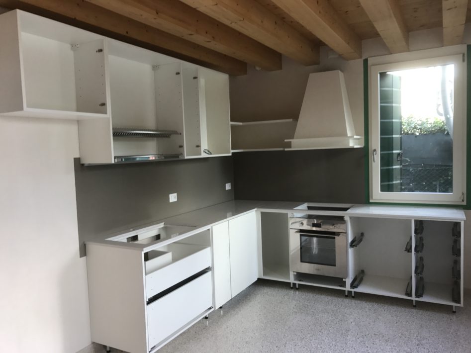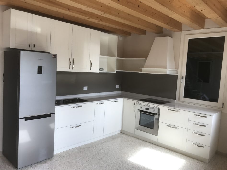 Cucina in legno rovere massiccio spazzolato e laccato bianco. Iniziando da un’ idea di country abbiamo modificato la forma per presentare un prodotto moderno. Abbiamo anche utilizzato una finitura particolare che si chiama “soft- touch” ed è una finitura anti impronta.